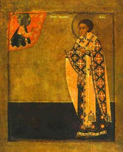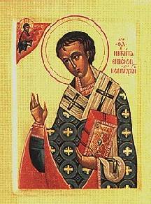 ФРАГМЕНТЫ ЖИТИЯ СВЯТИТЕЛЯ НИКИТЫ В "Росписи, или кратком летописце Новгородских владык" святитель Никита значится шестым Новгородским епископом. Никита - один из наиболее ранних святых Русской Православной Церкви. Его почитание отмечено еще в XII веке. Сведения о его жизни сохранил преподобный Поликарп со слов жившего в XIII веке святого Симона, епископа Владимирского и Суздальского, автора "Сказания о святой чудотворной церкви Печерской Киевской, како создася, украсися и освятися". Святитель Никита чтился и как защитник Отечества, покровитель воинов. Летописец, рассказывая о походе Новгородского князя Мстислава и о его победах, Замечает, что Мстислав вернулся "в град свой молитвами преподобного Никиты, епископа Новгородского". Скончался святитель Никита в 1109 г. (30 января 1108 по ст.стилю). В 1558 г. были обретены его мощи при царе Иване Васильевиче и митрополите Макарии и новгородском архиепископе Феодосии. Канонизация, называемая в русском православии прославлением святого, сопровождалось исцелением слепых и расслабленных. Во время Ливонской войны святителя Никиту видели на поле брани в архиерейском облачении, он благословлял русских воинов. Доныне цел каменный корпус новгородского архиерейского дома, и в памятниках, и в народном предании известный под именем Никитинского. Это самое древнее из дошедших до нашего времени строений архиерейского корпуса. Новгородский Софийский собор в Новгороде, расписанный по замыслу ер. Никиты сохранился по сей день. Иные храмы, возведенные в годы его архиерейства, пострадали во время войны 1941-1945 гг, называемой русскими Великой Отечественной. ***